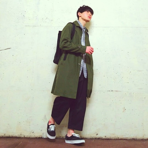 こちらは、ライトグレーのチェックシャツにロング丈のカーキジャケットを合わせたコーデ。ステンカラーコートは薄手の生地なので、ちょっと肌寒いくらいの季節にピッタリです。中のシャツはインせずあえてラフにすることで、飾り気のないワンマイルコーデに。スタイリッシュ見えするジャケットは、ワイドパンツやスニーカーでハズしてカジュアルに着こなすのもおすすめです。