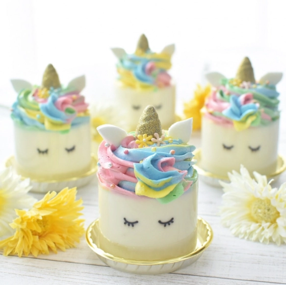 @yuni_sweetsさん作のユニコーンケーキは、ヨーグルトミルクプリンを使ったかわいいミニタイプ。取り分けしやすいから、パーティーなどにもぴったりですね!ユニコーンの耳はマシュマロ、角にはなんとたけのこの里を使っているそう☆