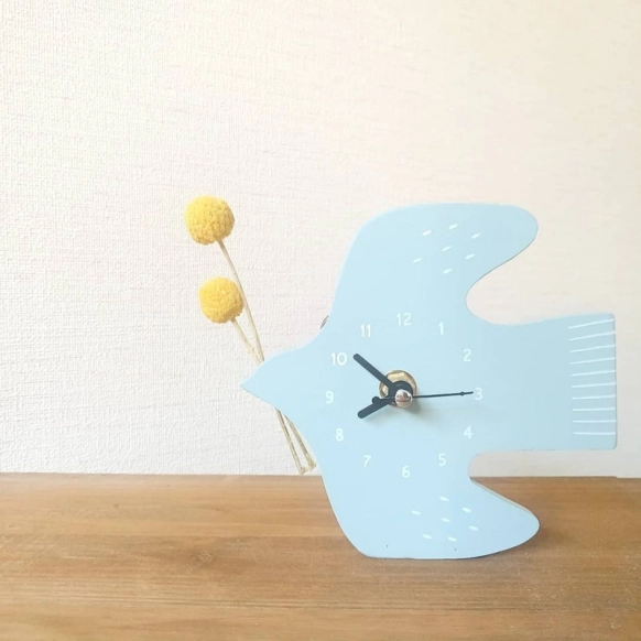 こちらもミモザシリーズと同時期に販売された「木製テーブルクロックバード」です。価格は500円のワンコイン!手書きのような丸っこい数字表記と柔らかな水色の鳥さんモチーフがかわいらしい。時間を確かめるたびにほっこり癒されそうですね。