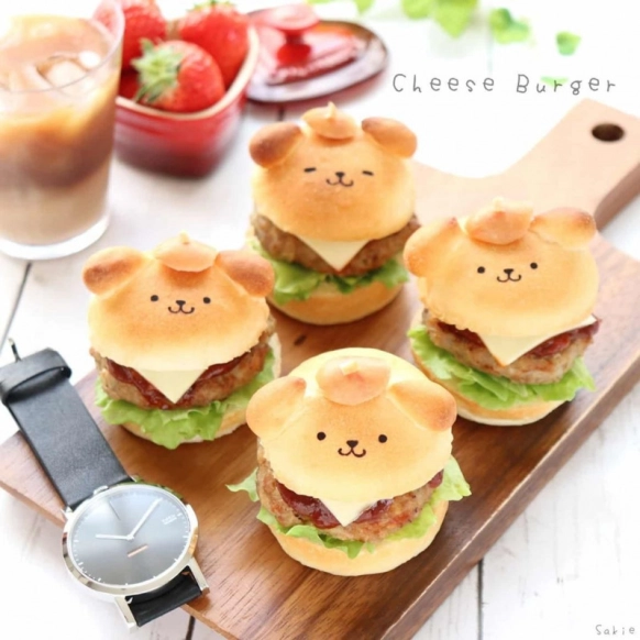 @ske.fさんはハンバーグを挟んだポムポムプリンのチーズバーガーをおうちランチに。こんなにかわいいバーガーが食卓に並んでいたらうれしいですよね!ポムポムプリンのコロンとした丸さを上手く出したポムポムプリンフードです☆