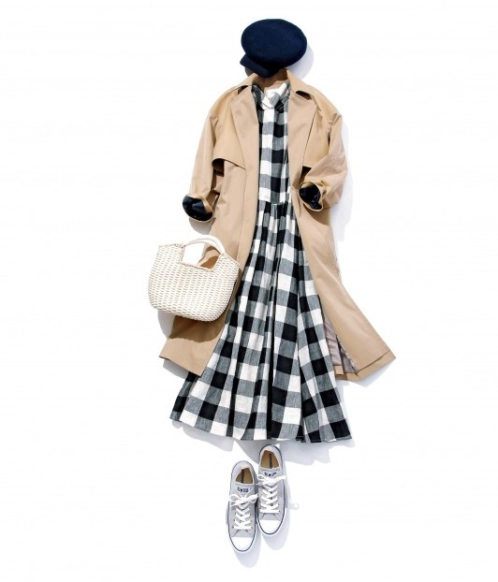 暖かな日差しが似合うチェックのワンピコーデは、キャスケットとかごバッグをアクセントに。グレースニーカーで抜け感を演出した大人かわいいコーデです。トレンドのトレンチコート×グレースニーカーは春・秋コーデに活躍させたいベストバランスな組み合わせ。