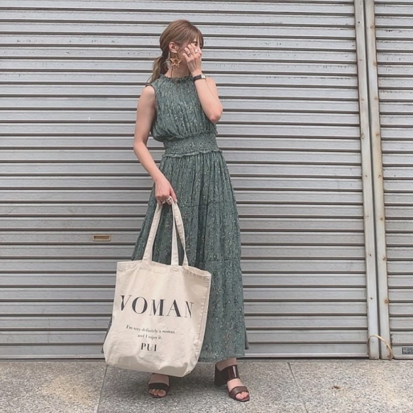夏は花柄ワンピースを主役にさらりと着こなして。白小物がコーデをより華やかにしてくれます。顔周りを彩る大ぶりピアスも、夏にぴったりのアイテムです。