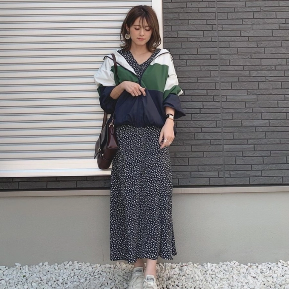 かわいい印象の花柄ワンピースにマウンテンパーカーを合わせてカジュアルダウンするのもいいでしょう。足元はカジュアルさが際立つスニーカーがお約束です。