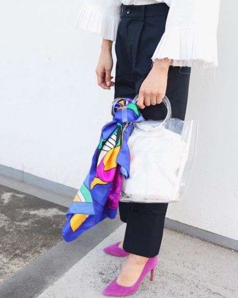 レトロ感を出すには、小物使いにも注意してみましょう。気軽に使えてコーデに取り入れやすいのがスカーフ。首元に添えてアクセントにしたり、バッグのワンポイントとして取り入れても◎