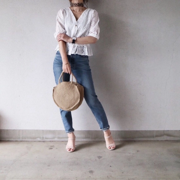 @re_ma01さんは、花模様になったパンチングレースのブラウスを着用。首元にレオパードスカーフを合わせてコーディネートしています。