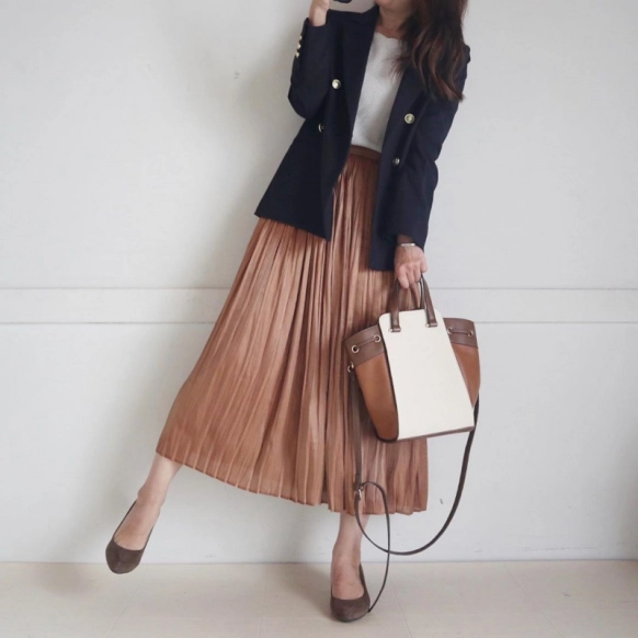 オフィスカジュアルにもおすすめのこちらは、コンサバのマストアイテム“紺ブレ”にプリーツスカートとパンプスを合わせた秋コーデです。ジャケット以外のアイテムの色のトーンを合わせることで、まとまりが出て上品な印象に。