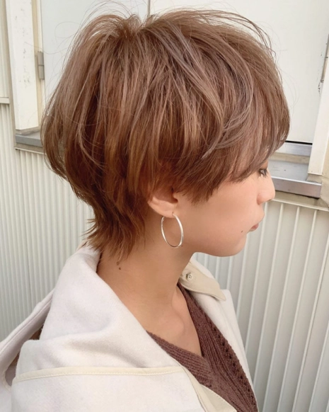 明るめのオレンジブラウンで、ショートヘアがさらに明るく柔らかい印象に。ふわっとした毛先のカールが、明るく元気な雰囲気にマッチしていますね。ボーイッシュになりがちなショートヘアも、髪色が違うとフェミニンな女性らしい印象です。
