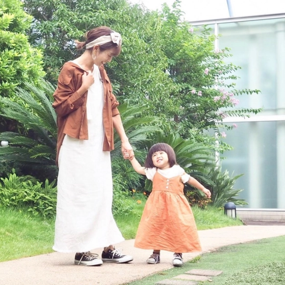 @nyanchococoさんのオレンジブラウンを取り入れた親子コーデです。お母さんはブラウン寄りのカラーで落ち着いた雰囲気に。子ども服には明るめのオレンジブラウンを選ぶことで、かわいらしい印象になります。ホワイトとの組み合わせがナチュラルで素敵な親子コーデですね。