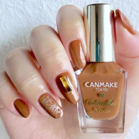 『CANMAKE(キャンメイク)』の「カラフルネイルズ」360円(税抜)は根強い人気です。中でも「N36 ビターキャラメル」は、名前の通りビターキャラメルのような、黄色寄りのオレンジブラウン。重くなりがちなブラウンネイルもオレンジが入ることで明るい印象になりますね。