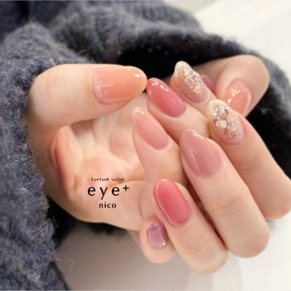 春といえばやっぱりピンクという人も多いはず。普通のピンクネイルに飽きてしまった人は、爪ひとつひとつのベースカラーを変えたデザインがおすすめ。オレンジやピンク、ピンクベージュなどを使って、指先を明るくしちゃいましょう。人指し指はラメやパールをあしらって、華やかさもプラスさせるのが正解!