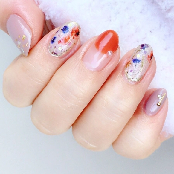 今春は@ mayooo.tgさんのような、クラッシックな雰囲気のフラワーアートも人気です。中指の元気なオレンジカラーが良いアクセントになっていますね。親指や小指もさみしくならないように、金箔やホロを飾ることでまとまりのあるデザインに。