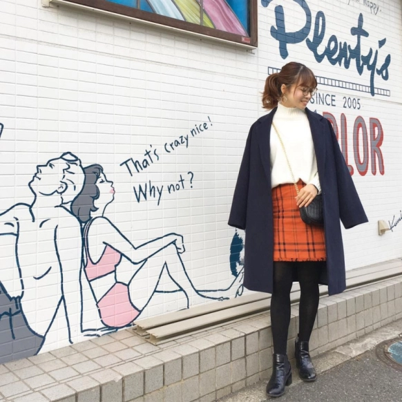 明るいオレンジが目に飛び込んでくるスカートはユニクロのアイテム。トップスとブーツのブラックでオレンジを引き立てています。コートのチェック柄にあるオレンジラインとスカートのオレンジがきれいにリンクしていますね。