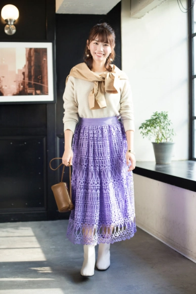 オーバーサイズチュニックシャツ ¥1,990/GU(0120-856-452)、クルーネックニット ¥1,990/UNIQLO(0120-170-296)、レーススカート ¥2,768・ショートブーツ ¥3,263/神戸レタス、ピアス ¥9,000・バングル ¥7,855/ともにアビステ(03-3401-7124)オーバーサイズなシャツの着回しには「シャツとして着用する」以外にも、「ボタンを開けてジャケットっぽく羽織る」「ラフな腰巻き」「エレガントに肩掛け」の3つのバリエーションあり! 今回提案するのは品の良いかわいらしさが演出できる「肩掛け」スタイル。トップスはアースカラーのシャツと同系色のアイボリーのニット。シャツは広がりすぎないように前ボタンを閉じてから肩掛けしているのがポイントです。コンパクトなシルエットのほうがキレイめにまとまりますよ♡トップスがベーシックカラーなのでスカートは明るい色で華やかに。春先ならパステルカラーがマスト。今回は可奈子さんの色白肌に合わせてラベンダーのスカートをチョイスしましたが、レモンイエローやミントグリーンも素敵です。足元は今っぽい白のショートブーツで軽やかに。白のブーツは一見難しく感じますが、ワイドパンツやロングスカートなどロング丈のボトムならばさほど色を選ばず合わせやすいのでオススメ。甘さを出しつつ大人っぽくしたいときに使えます。小物はコロンとした筒型のベージュのレザーバッグ。ボトムの素材感が強いときはデコラティブなバッグや生地に特徴のあるバッグよりも、良い意味でオーソドックスな素材を選ぶとGood!