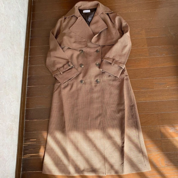 使われている生地は、千鳥格子柄でクラシカルな雰囲気が出ています。腰回りや袖回りにはベルトがついており、トレンチコートのデザインが生かされています。