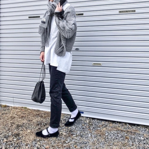 ショート丈のグレーカーディガンには、ビッグシルエットのトップスを合わせてラフっぽさをプラス。首元のマフラーでボリュームを出したら、黒のボトムで引き締めて。白の靴下にストラップシューズでガーリーな要素をプラスすれば、大人ニュアンスコーデの完成です。