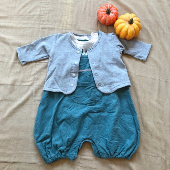 まんまるシルエットがかわいいサロペットに、白のインナーとコットン素材のカーディガンを合わせたコーデ例です。シンプルなアイテムを合わせてサロペットを引き立てて。子どもの体温調節にもカーディガンが一枚あれば重宝しますね。