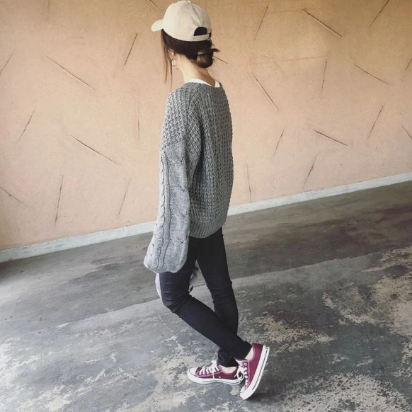 ざっくりしたローゲージのカーディガンはぽわんとした袖口のシルエットが魅力。ボリュームのあるトップには、タイトなシルエットのスキニーが正解。ゆるくまとめたヘアにナチュラルカラーのキャップをオンすれば、女っぽカジュアルな着こなしに仕上がります。
