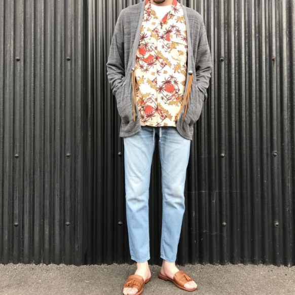 コンチョボタンがおしゃれな杢グレーのカーディガンにアロハシャツを合わせた、遊び心あふれるメンズコーデ例です。足元はサンダルで肌見せすれば、大人の余裕たっぷりのアメカジコーデが完成!