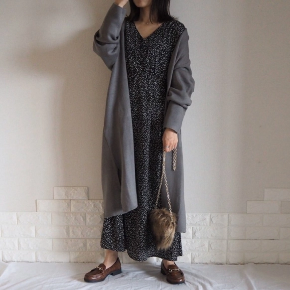ロングカーディガンにマキシ丈のワンピースを合わせれば、ぐっとレディな雰囲気に。素足にローファー、ファーバッグを合わせた上級者向けのコーデですね。適度に肌見せすることで、暗いトーンのコーデも重たい印象にならず、抜け感のある旬な着こなしに仕上がっています。