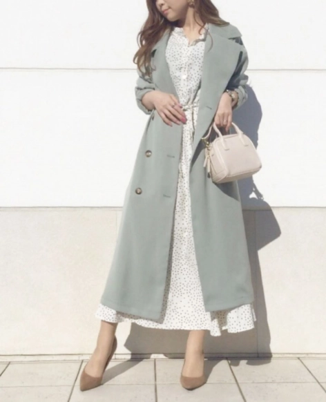ドット柄のワンピースは、この春のトレンドアイテムとしても注目されています。そんなドットとトレンチコートも相性のいい組み合わせ。カラーレスなドット柄のワンピースは、グリーンのコートを羽織ることで華やかにまとまります。