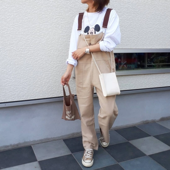 @hieriraさんは、肩ひもと布地が異素材のサロペットを着用。シンプルなシルエットにおしゃれなデザインが光っていますね。サロペットから覗くミッキーがとってもキュート♡