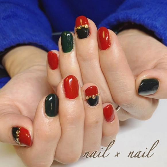 シンプルなデザインがお好みなら単色塗りがおすすめ。赤と黒を交互に塗るとおしゃれ感をアップすることができます。爪の上下で赤と黒を分けると違った雰囲気に♡分けた部分にストーンをのせるとシンプルの中にも華やかさを演出できますね。