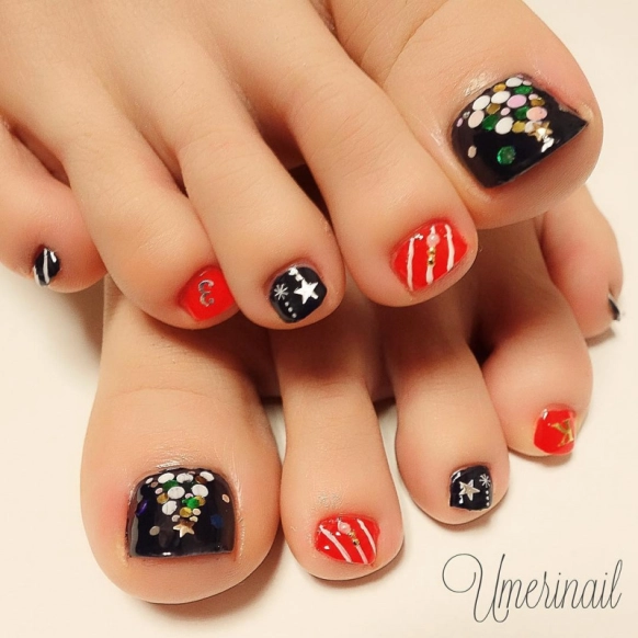 赤×黒ネイルは派手かな?と感じる方は、フットから取り入れてみてはいかがでしょうか?フットは少し派手かなと思うくらいが映えてかわいいですよ♡@umerinailさんのネイルはポップなデザインですが、朱色に近い赤と黒を使って大人っぽい雰囲気に仕上げています。