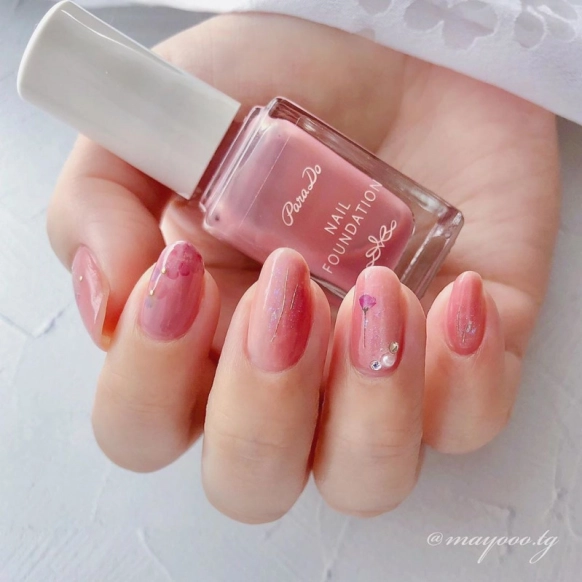 ピンクベージュは、春のオフィスネイルに欠かせないネイルカラーです。@mayooo.tgさんが使用されているのは、『Para Do(パラドゥ)』の「ネイルファンデーション」。「RO01 ローズオークル」は淡いピンクベージュで、手元を美しく見せてくれると話題のカラーです。春っぽさをアップさせるために、ラメを重ね塗りしたりフラワーシールをプラスするのも素敵ですね。