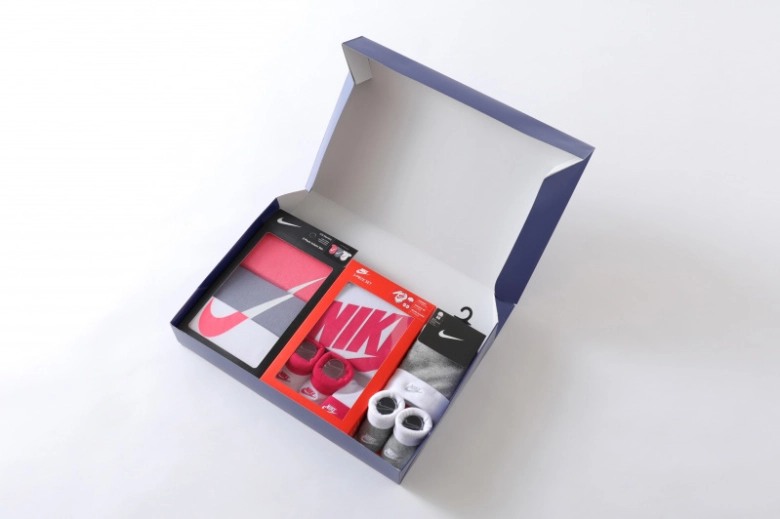 こちらは新生児から6カ月頃までのベビーに使える「BABY SET BOX」3,000円(税抜)。ボディ―スーツと靴下、帽子がセットになっているので、お祝いにもおすすめです。絶妙なカラーリングがおしゃれ♡かわいらしい色合いの中に書かれた、ミックスカラーのナイキのロゴがアクセントになっています。