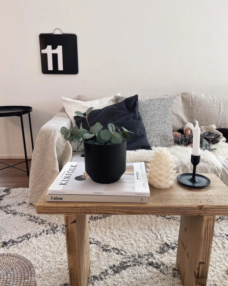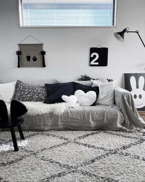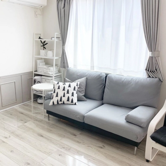 続いて@snow25.homeさんのアイデア。座面、背面、肘置きをそれぞれはずしてかぶせる形で手作りしたというソファーカバー。もともとは黒だったこちらのソファーが、優しいグレーに大変身しています。モノトーンのお部屋に馴染んでいてとても手作りには思えませんよね。