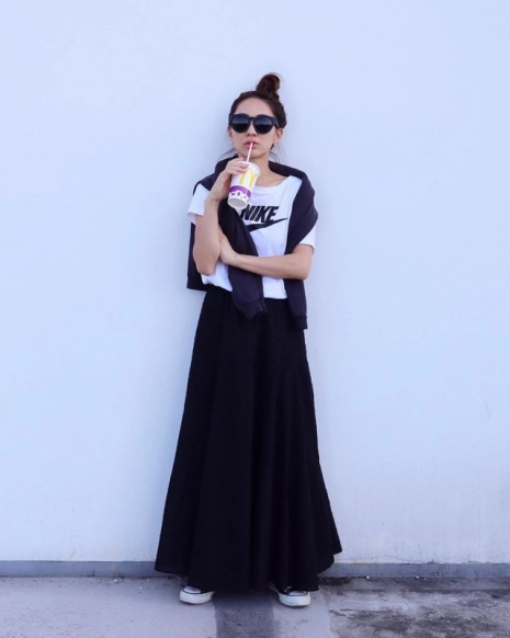 シンプルな『NIKE(ナイキ)』のロゴTシャツ×ALLブラックのシンプルなコーデ。スカートにインすることで、ロングスカートと合わせてもスッキリとした印象です。