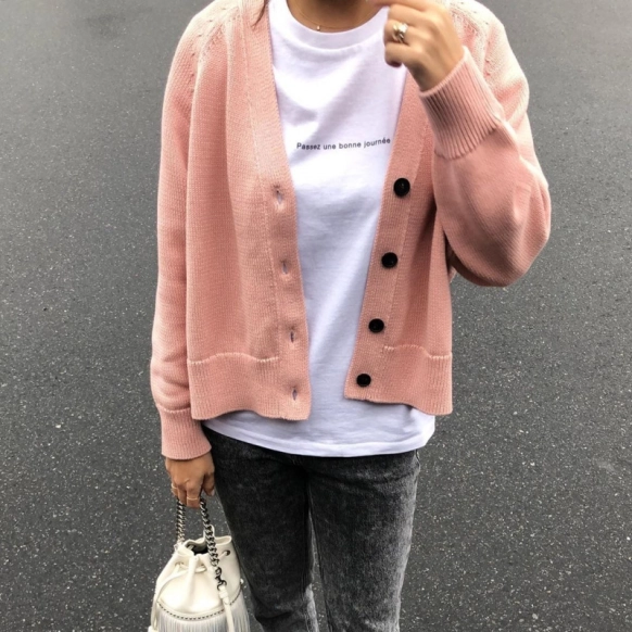 @sa_youuさんは、ご自身がプロデュースする『DAME FRANK(ダムフランク)』のロゴTシャツにピンクのカーディガンとケミカルパンツを合わせたコーデ。Tシャツに書かれた文字はフランス語で"passez une bonne journée/素敵な1日を!"という意味だそう。かわいいピンクとポジティブなメッセージは、身に着けているだけで元気が出そうですね。