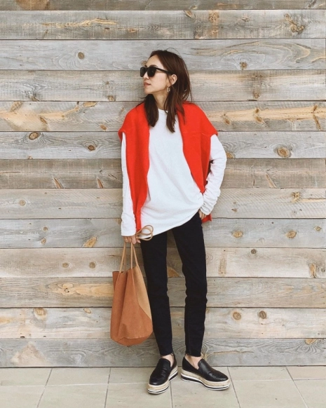 @cozue_nさんの『Deuxieme Classe(ドゥーズィエムクラス)』のロンTに『BANANA REPUBLIC(バナナパブリック)』のブラックパンツを合わせたシンプルなコーデ。指し色の赤いニットが素敵ですね。細身のパンツを合わせることで、スッキリとした印象に。