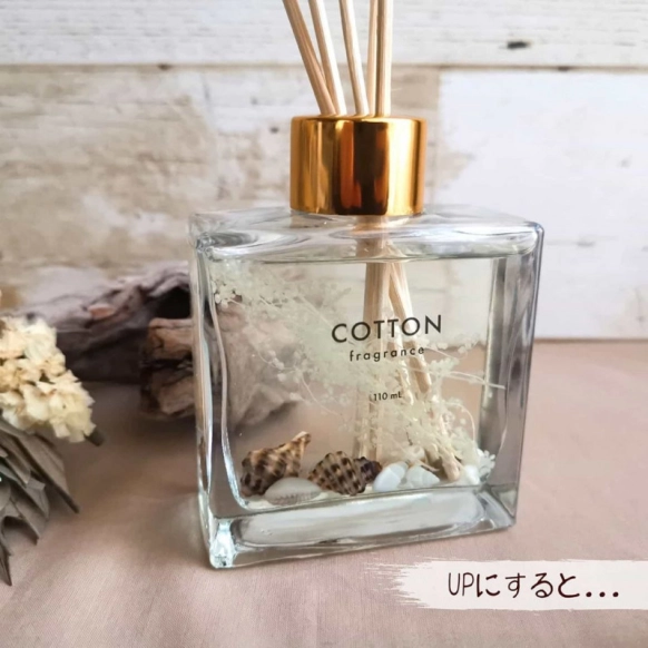 こちらも同じくダイソーで300円(税抜)の「プリザーブドディフューザー」。ボトルの中に入れられた貝殻とプリザーブドフラワーがおしゃれです。何種類かある匂いの中から好みのものを選べるのもうれしいですね。