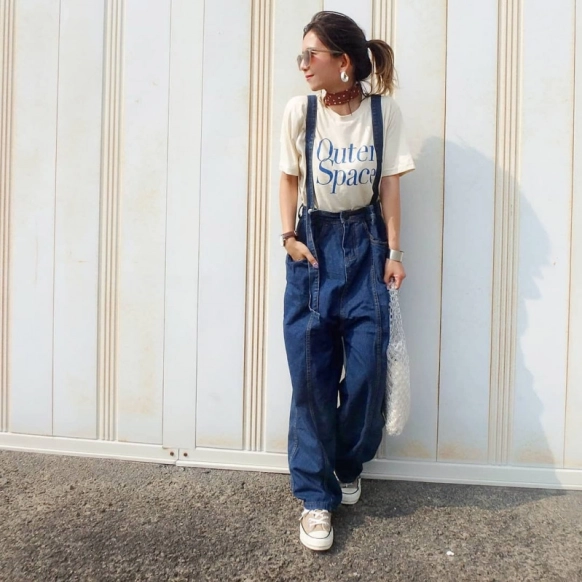 デニムサロペットとスニーカーはカジュアル感が強く、子どもっぽくなってしまうことも。こなれ感のあるベージュコンバースと小物使いで、垢抜けた大人カジュアルコーデに仕上げましょう。