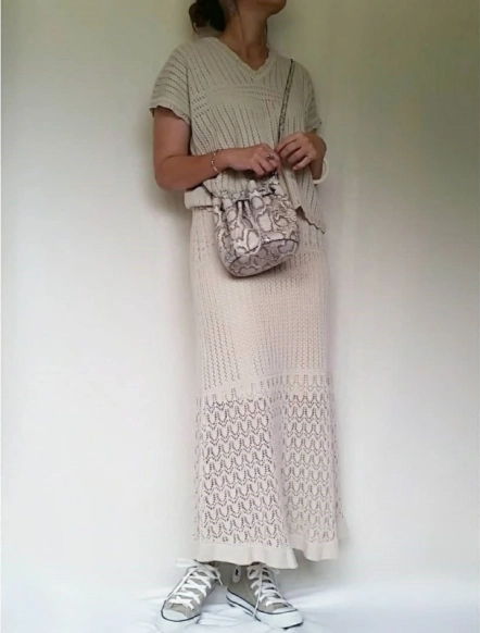 ベージュコンバースは、透かし編みニットのセットアップに合わせても◎ナチュラルな雰囲気を壊さず、涼し気な印象にしてくれます。辛口バッグを合わせて遊びを効かせるのも良いですね。