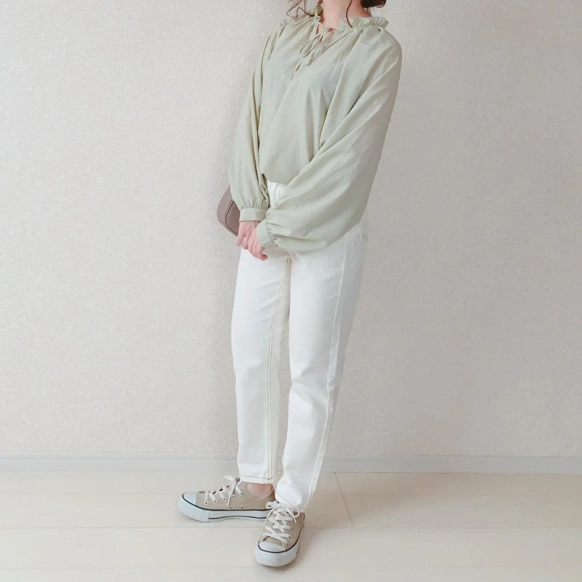 襟元にあしらったフリルとドルマンスリーブがポイントの、かわいらしいブラウス。甘さのあるトップスですが、ベージュコンバースでほど良いカジュアル感がプラスされています。ボトムスが白でも、ベージュスニーカーなら足元が浮くこともありません。