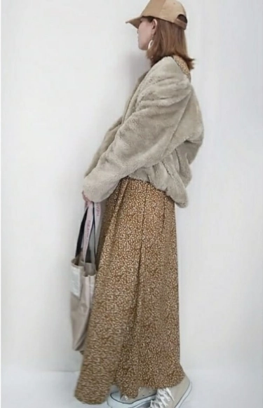 ブラウンの女らしい小花柄ワンピースを、キャップ、ボアブルゾン、ベージュコンバースでカジュアルに仕上げたコーデ。小物の色みをベージュコンバースとそろえれば、バランス良くまとまります。