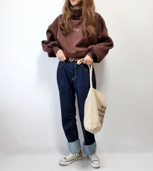 ボリューム袖とオフタートルでガーリーっぽさのあるスウェットと、メンズデニムを使ったカジュアルコーデです。デニムの裾をロールアップしてベージュコンバースを合わせれば、スッキリとした足元に。