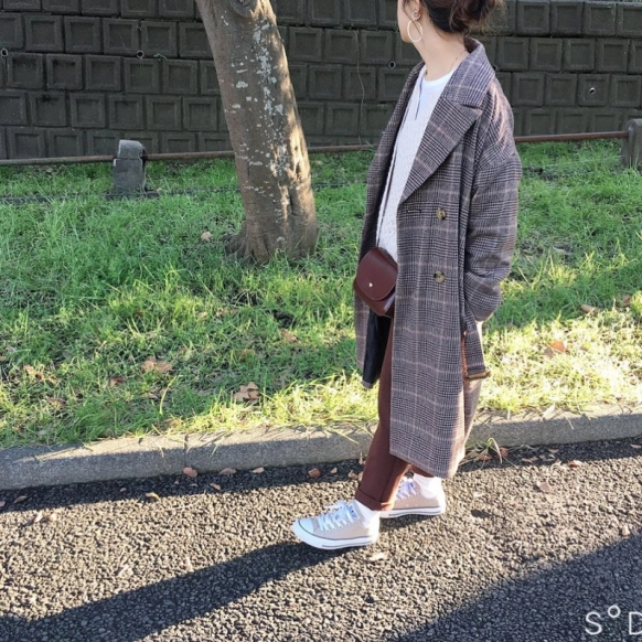 チェックコートとスラックスを合わせたかっちりコーデを、ベージュコンバースでちょっぴりカジュアルダウン!ベージュコンバースならカジュアル感が主張し過ぎず、上品に仕上がります。