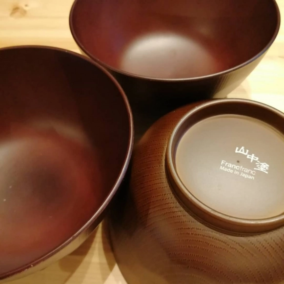 こちらの木目調の食器は山中塗の丼だそう。ユーザーさんは、丼や汁物、子どものうどんにと幅広く使用されているそうですよ。全く同じものは現在公式ページでの取り扱いはないようですが、汁椀はフランフランの定番のようです。