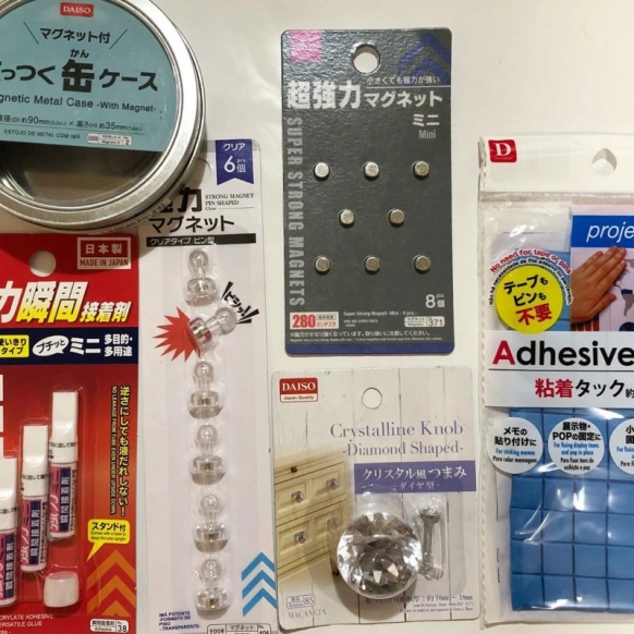 1.「クリスタル風つまみ」の裏側に強力瞬間接着剤をつけ、「超強力マグネットミニ」を必ず裏表の確認してから貼りつける