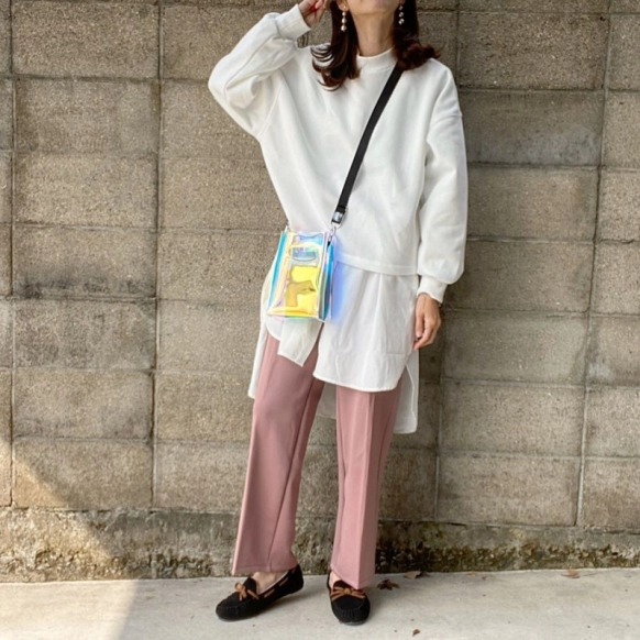 続いて@satoemi.1002さんのコーデ。こちらもモックネックスウェットと合わせていますがホワイト×くすみピンクだとイメージがこんなにがらりと変わるんですね。ややシアーなシャツとオーロラカラーのクリアバッグで今っぽいムードたっぷり。