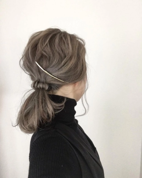 首元にゆるく作られた低めシニヨンは、大人かわいいまとめ髪として人気!とても簡単にできてオフィスヘアにもぴったりなので、ロングヘアにおすすめです。下目の位置でポニーテールをしたあと、くるりんぱをします。毛束を左右に分けて交互にねじり、上方向にくるくると巻きます。くるりんぱの結び目の部分に巻きつけた髪を入れ込み、ピンで留めればできあがり!きっちりとピンで留めなくても、少しルーズに髪の毛が出ているくらいでOK。着物などの和装スタイルにもおすすめのヘアスタイルです。