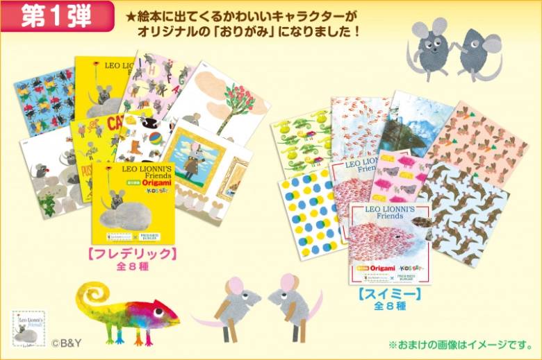 コラボ期間中に登場するおまけは、おりがみやシール、タオルハンカチなど。全16種類の展開が予定されています。第1弾は、「おりがみ スイミー」と「おりがみ フレデリック」♡数あるレオ・レオニの人気絵本から、それぞれ8種類の絵柄がおりがみになって登場します!