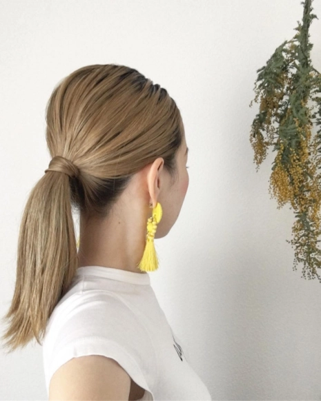 前髪をがばっとあげた、オールバックスタイルのシンプルポニーは、クールでできる系女子な雰囲気を作り出します。ここでシンプルなポニーテールに一工夫。結び目を髪の毛で巻くことで、グッとおしゃれ感を出すことができますよ。ヘアアクセなど一切なしで、華やかなピアスでアクセントをつけても◎