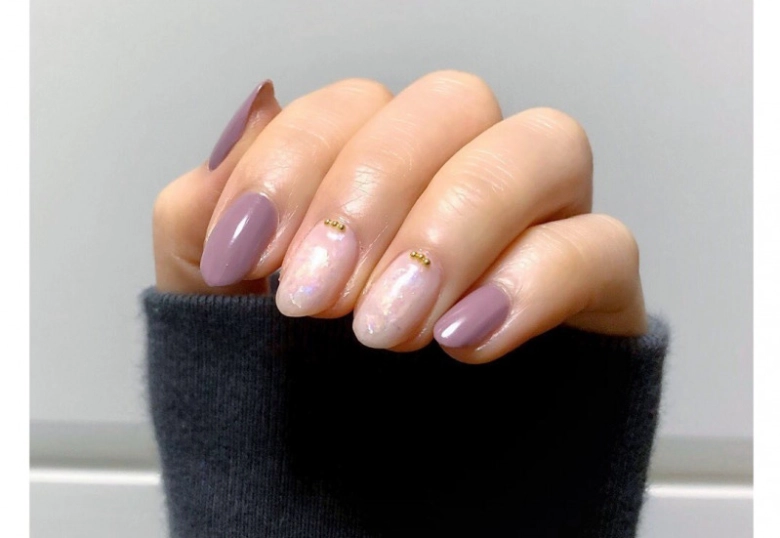 ワンカラーの上にラメやシェルを乗せることで、シンプルなだけじゃない大人かわいいネイルになっています。主張しすぎないように、ラメの量を調整することがポイントです。グレージュ、ベージュ、パープルでまとめたネイルですが、紫の色味が入るだけで梅雨の季節感を感じられますね。すぐそこに迫る初夏を連想させるシェルもポイントです。