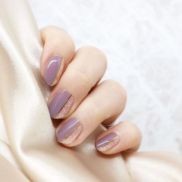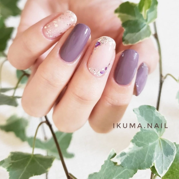 シンプルで大人っぽいデザイン。スモーキーパープルのグレーともパープルとも言い切りにくい色合いが絶妙です。この色をメインカラーにする場合は、明るい色と組み合わせることがおすすめ!梅雨時期のおしゃれに彩りを加えてくれます。セルフでも挑戦しやすそうですね!