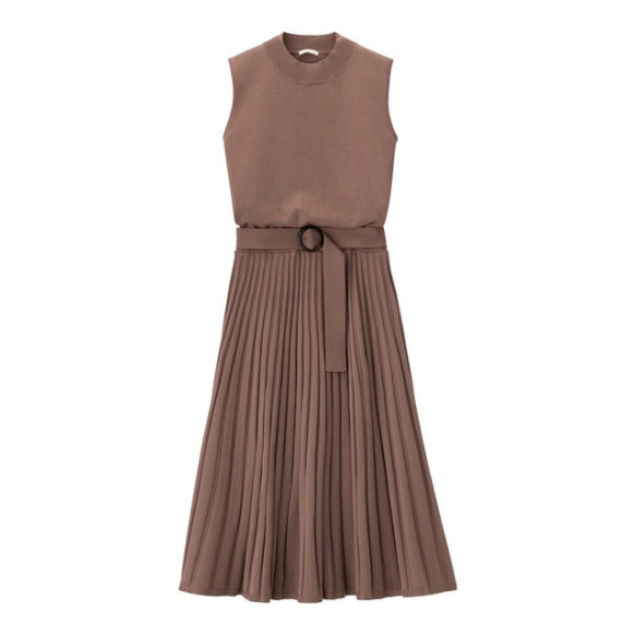 おすすめのノースリーブニットワンピースは、『GU(ジーユー)』の「プリーツコンビネーションニットワンピース(ノースリーブ)」2,490円(税抜)。スカート部分にプリーツが入ることで、落ち着いた印象になります。幅広い年齢に使えるアイテムですよ。