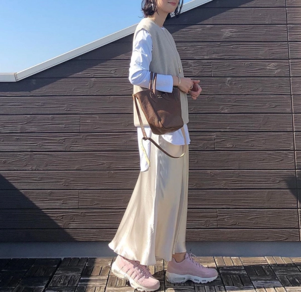 こちらはベージュのワントーンコーデ。スーピマコットン素材のオーバーサイズクルーネックベストとZARAのサテンスカートと合わせれば、異素材MIXで上級者コーデが叶います♡インナーに白のカットソーを取り入れて抜け感のあるフレッシュな印象に。